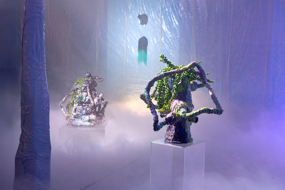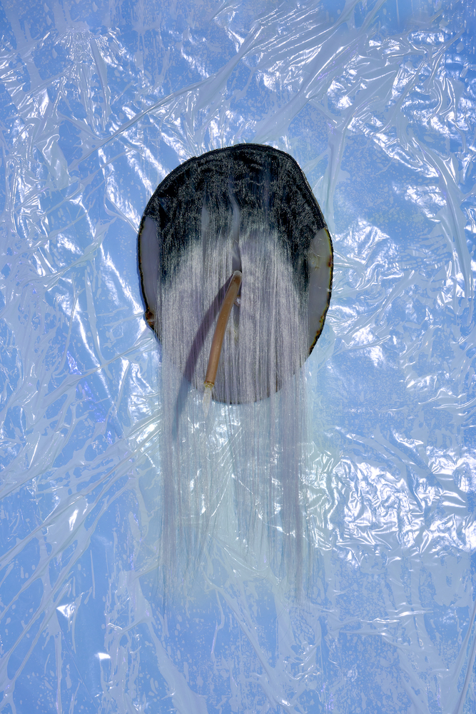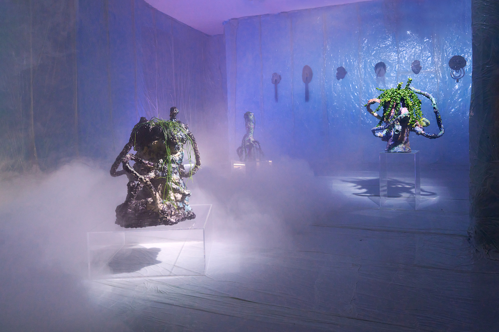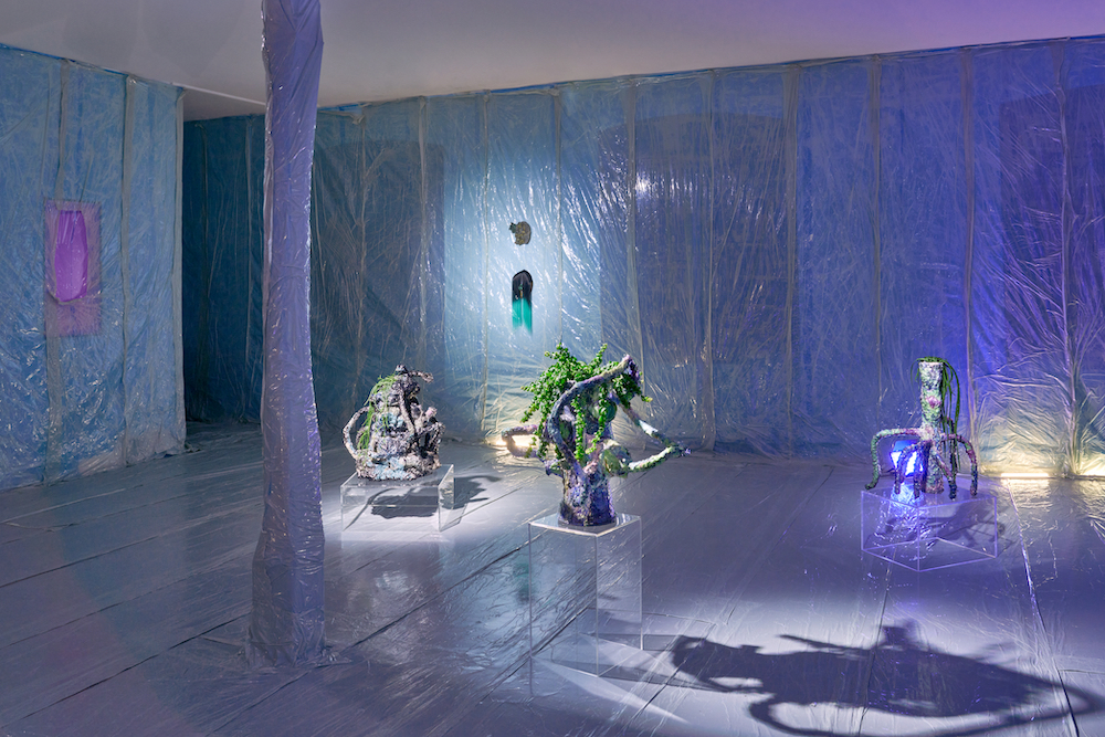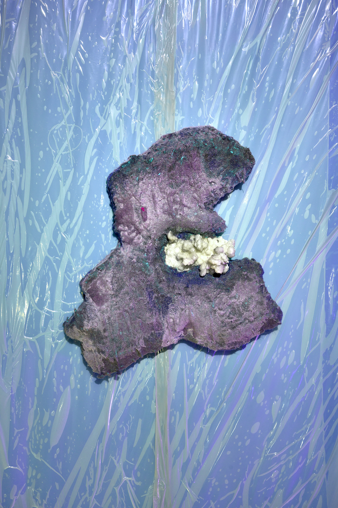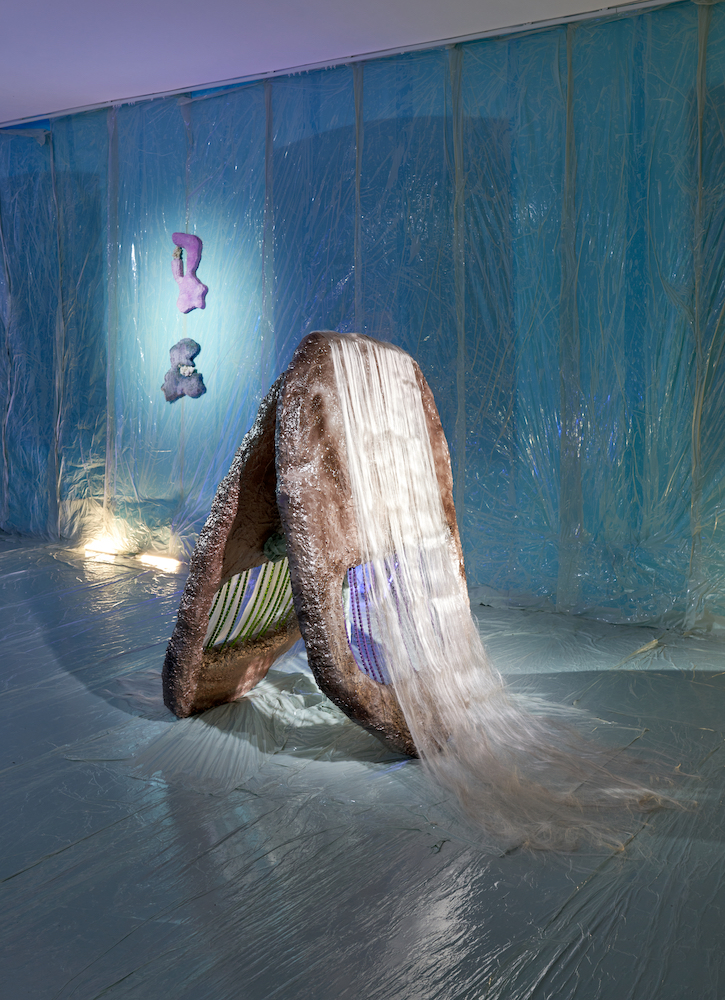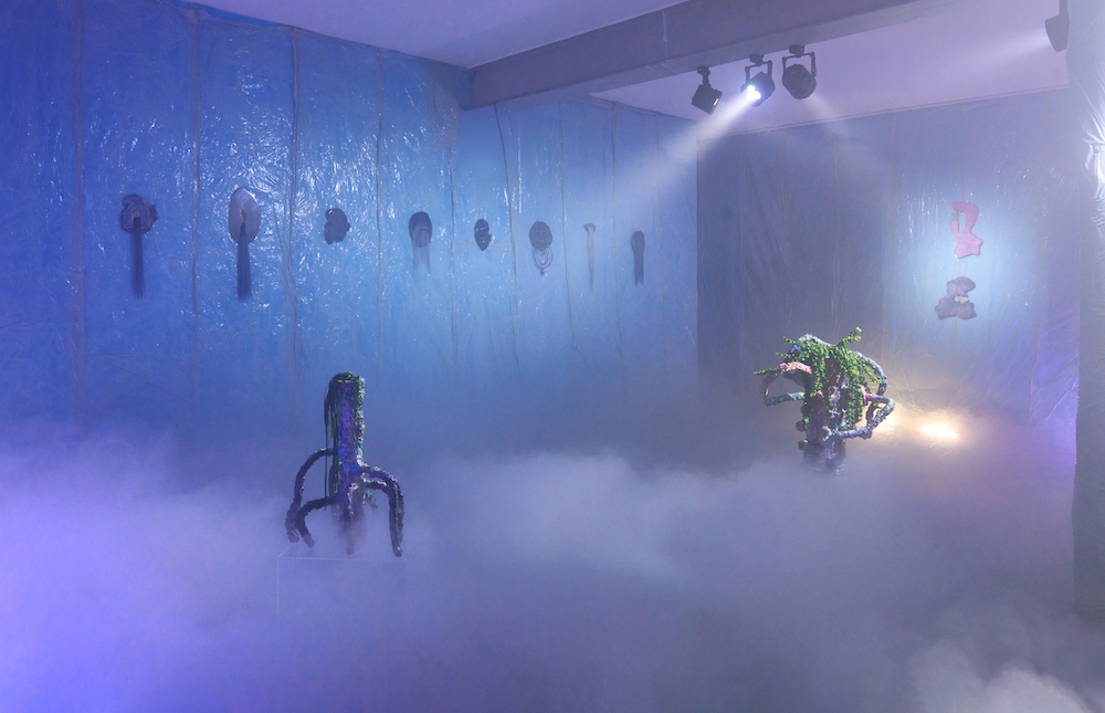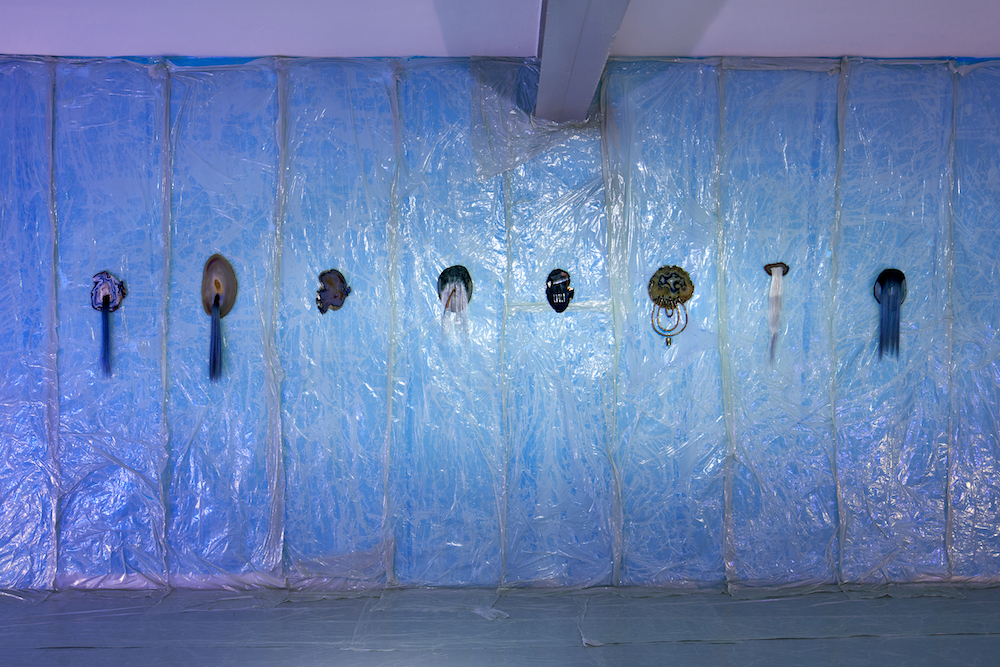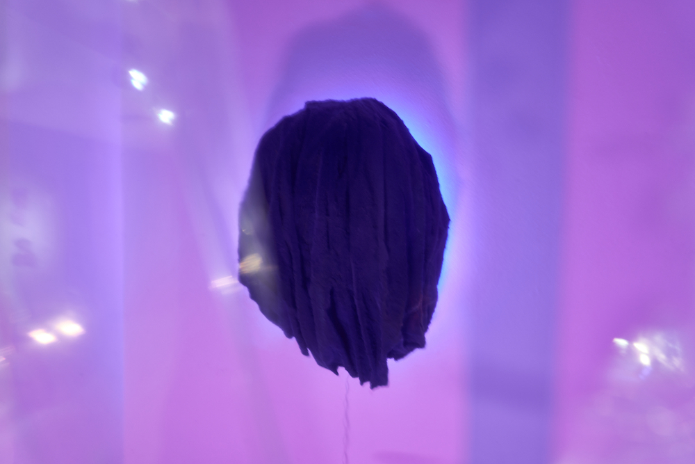 Tina Kohlmanns Arbeiten bewegen sich genau in diesem Spannungsfeld zwischen Materialität und Imagination, zwischen Körper und Spekulation. Ihre Objekte wirken wie Überbleibsel einer fremden Kultur – Relikte aus einer Sphäre, die sich gängigen Ordnungen entzieht. Dabei sind ihre Skulpturen ebenso humorvoll wie unheimlich, ebenso künstlich wie verletzlich. Der Ausstellungsraum verwandelt sich dabei zu einem liminalen Raum, den Stofflichkeit und Licht zu einer blauen Membran zwischen Realität und Imagination verdichten.