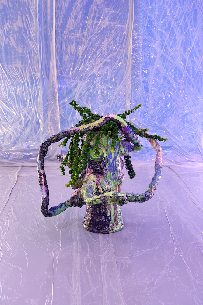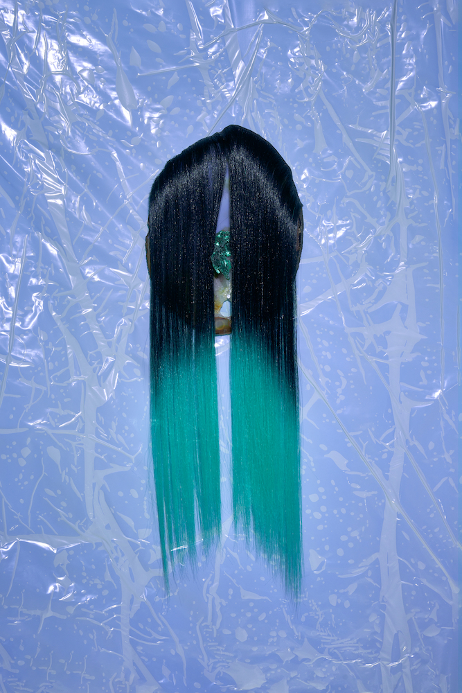 Entlang der Stirnwand hängen acht Achatscheiben, ein Stein, dem schützende und beruhigende Kräfte zugeschrieben werden. In ihrer ovalen Form erinnern sie an eine Ahnengalerie geisterhafter Gesichter, versehen mit Bergkristallen, Glocken oder Haarextensions – letztere integriert Kohlmann seit ihrem Aufenthalt in New York in ihr Werk. Die Objekte oszillieren mit Evans und Marshall (beide 2020) zwischen melancholischer Jugendästhetik und spiritistischen Figurationen wie bei den mediengleichen Köpfen Stanislawa P. (2020) und Eva C. (2025), aus deren Körperöffnungen scheinbar Ektoplasma fließt. Hier jedoch sind es die synthetische Haarsträhnen, die aus den mineralischen Formen herauszuwachsen scheinen. Kohlmann zelebriert den Zusammenstoß gegensätzlicher Materialien: Achat trifft auf Plastik, Gips auf Epoxidharz, Malachit auf Kunsthaar. Eine Gleichwertigkeit des Heterogenen, die an die Wunderkammer erinnert. Die drei freistehenden Skulpturen Crazal (2025), Cassotis (2022) und Chetel (2021) muten zugleich wie archaische Gefäße und organische Figuren der Unterwelt an. Beide Momente bündeln sich im mythologischen Titel Cassotis, der mit kassyo im Altgriechischen für „sticken“ oder „zusammenfügen“ steht und zugleich auf die Quellnymphe des Orakels von Delphi verweist, die der Priesterin ihre Weissagungen verlieh.