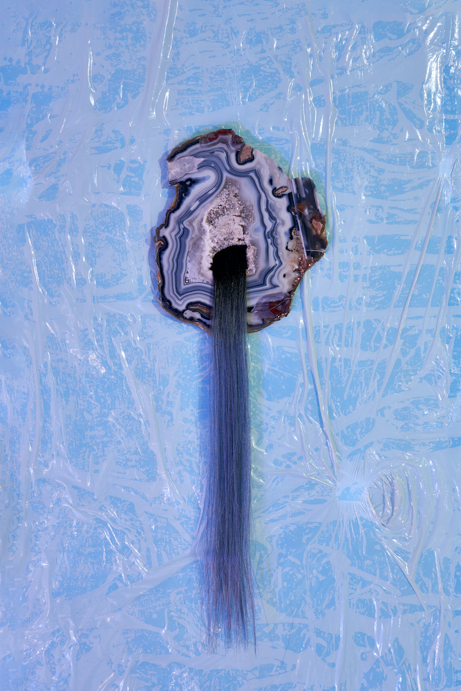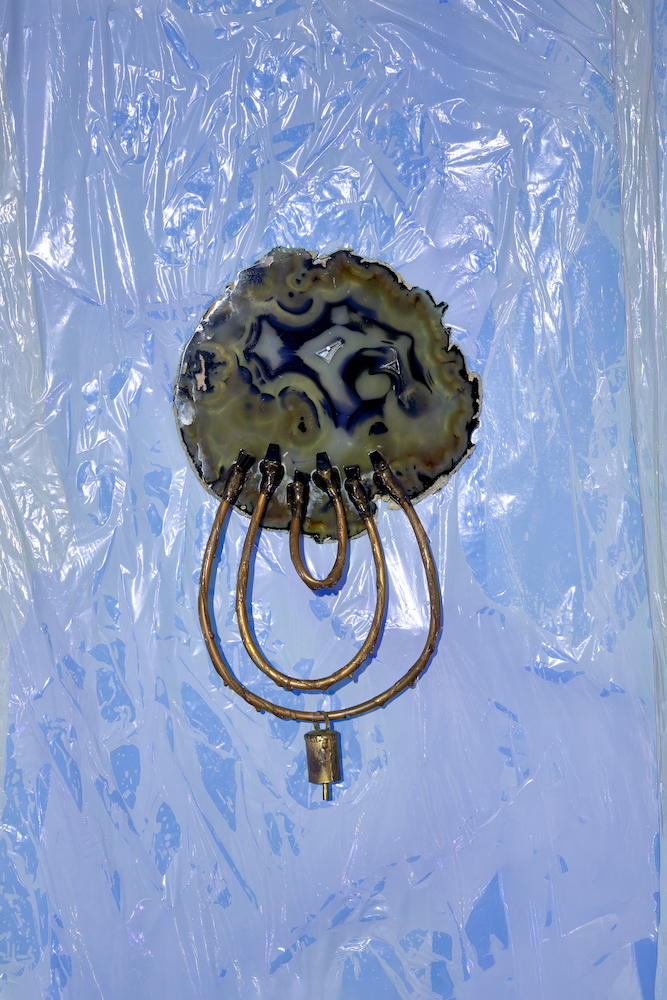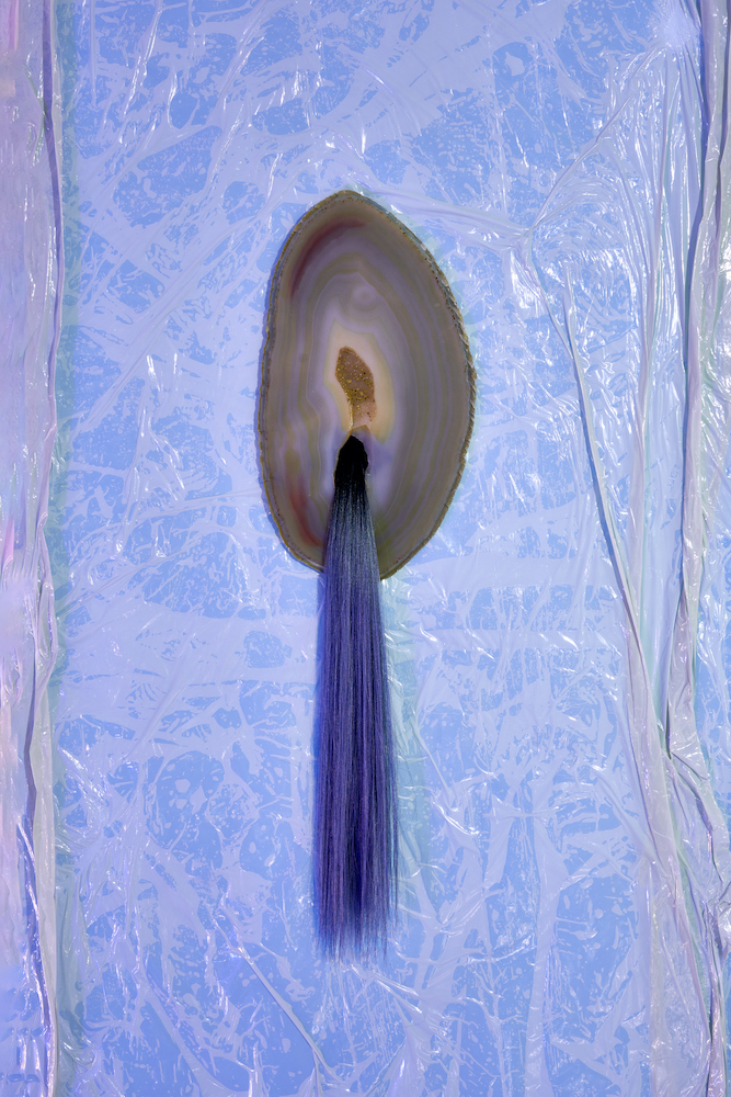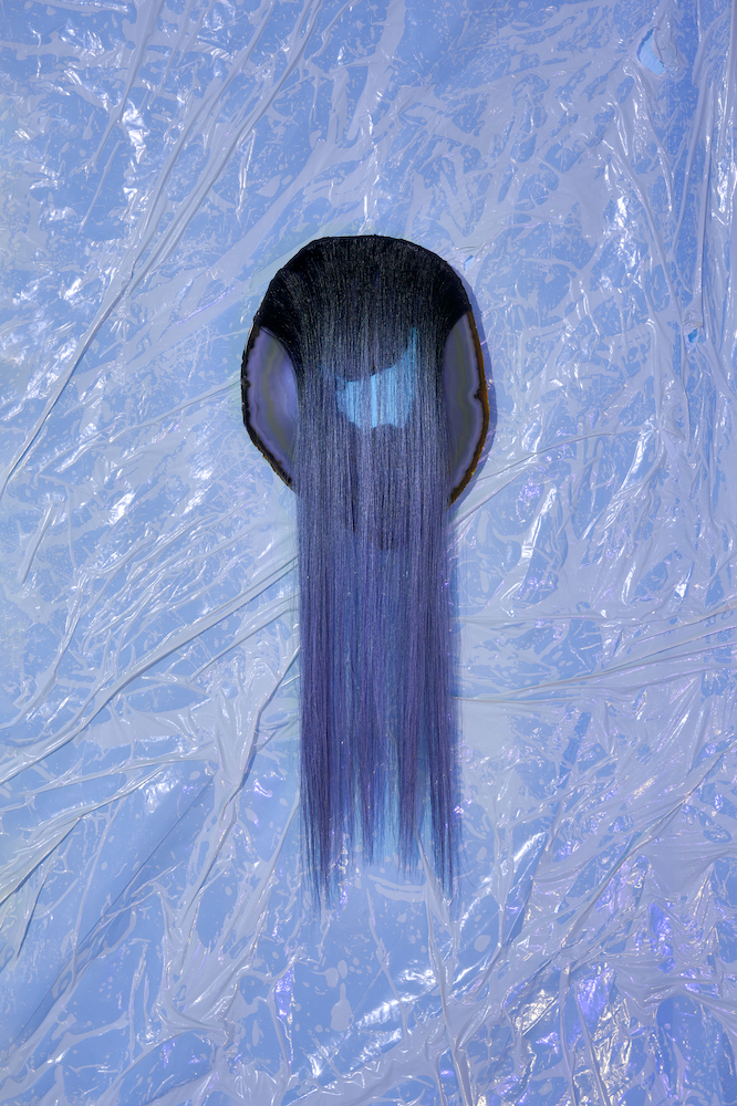 Along the front wall hang eight slices of agate, a stone associated with protective and calming qualities. Their oval forms evoke an ancestral gallery of spectral faces, adorned with rock crystal, bells or hair extensions – the latter having become integral to Kohlmann’s work since her time in New York. Oscillating between melancholy youth aesthetics like Evans and Marshall (both 2020), and spiritist figurations, such as the media-like heads Stanislawa P. (2020) and Eva C. (2025), from whose bodily orifices ectoplasm appears to flow. Here, however, it is synthetic strands of hair that seem to sprout from the mineral surfaces. Kohlmann revels in the collision of oppositional materials: agate meets plastic, plaster meets epoxy resin, malachite meets artificial hair. It is a parity of the heterogeneous, reminiscent of the wunderkammer. The three free-standing sculptures Crazal (2025), Cassotis (2022) and Chetel (2021) read simultaneously as archaic vessels and as organic underworld creatures. Both aspects converge in the mythological title Cassotis, derived from kassyo in Ancient Greek, meaning “to stitch” or “to join”, while also recalling the spring nymph of the Delphic oracle who bestowed her prophecies upon the priestess.