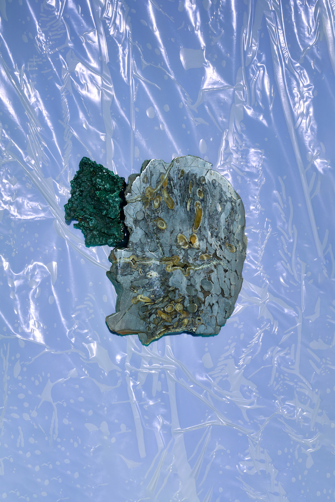 Entlang der Stirnwand hängen acht Achatscheiben, ein Stein, dem schützende und beruhigende Kräfte zugeschrieben werden. In ihrer ovalen Form erinnern sie an eine Ahnengalerie geisterhafter Gesichter, versehen mit Bergkristallen, Glocken oder Haarextensions – letztere integriert Kohlmann seit ihrem Aufenthalt in New York in ihr Werk. Die Objekte oszillieren mit Evans und Marshall (beide 2020) zwischen melancholischer Jugendästhetik und spiritistischen Figurationen wie bei den mediengleichen Köpfen Stanislawa P. (2020) und Eva C. (2025), aus deren Körperöffnungen scheinbar Ektoplasma fließt. Hier jedoch sind es die synthetische Haarsträhnen, die aus den mineralischen Formen herauszuwachsen scheinen. Kohlmann zelebriert den Zusammenstoß gegensätzlicher Materialien: Achat trifft auf Plastik, Gips auf Epoxidharz, Malachit auf Kunsthaar. Eine Gleichwertigkeit des Heterogenen, die an die Wunderkammer erinnert. Die drei freistehenden Skulpturen Crazal (2025), Cassotis (2022) und Chetel (2021) muten zugleich wie archaische Gefäße und organische Figuren der Unterwelt an. Beide Momente bündeln sich im mythologischen Titel Cassotis, der mit kassyo im Altgriechischen für „sticken“ oder „zusammenfügen“ steht und zugleich auf die Quellnymphe des Orakels von Delphi verweist, die der Priesterin ihre Weissagungen verlieh.