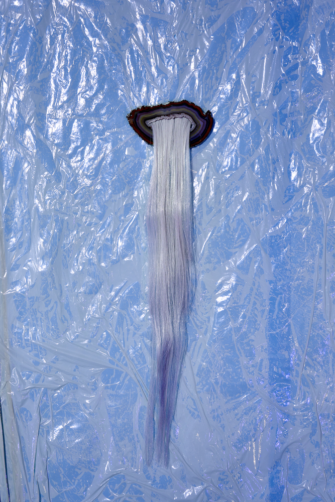 Along the front wall hang eight slices of agate, a stone associated with protective and calming qualities. Their oval forms evoke an ancestral gallery of spectral faces, adorned with rock crystal, bells or hair extensions – the latter having become integral to Kohlmann’s work since her time in New York. Oscillating between melancholy youth aesthetics like Evans and Marshall (both 2020), and spiritist figurations, such as the media-like heads Stanislawa P. (2020) and Eva C. (2025), from whose bodily orifices ectoplasm appears to flow. Here, however, it is synthetic strands of hair that seem to sprout from the mineral surfaces. Kohlmann revels in the collision of oppositional materials: agate meets plastic, plaster meets epoxy resin, malachite meets artificial hair. It is a parity of the heterogeneous, reminiscent of the wunderkammer. The three free-standing sculptures Crazal (2025), Cassotis (2022) and Chetel (2021) read simultaneously as archaic vessels and as organic underworld creatures. Both aspects converge in the mythological title Cassotis, derived from kassyo in Ancient Greek, meaning “to stitch” or “to join”, while also recalling the spring nymph of the Delphic oracle who bestowed her prophecies upon the priestess.