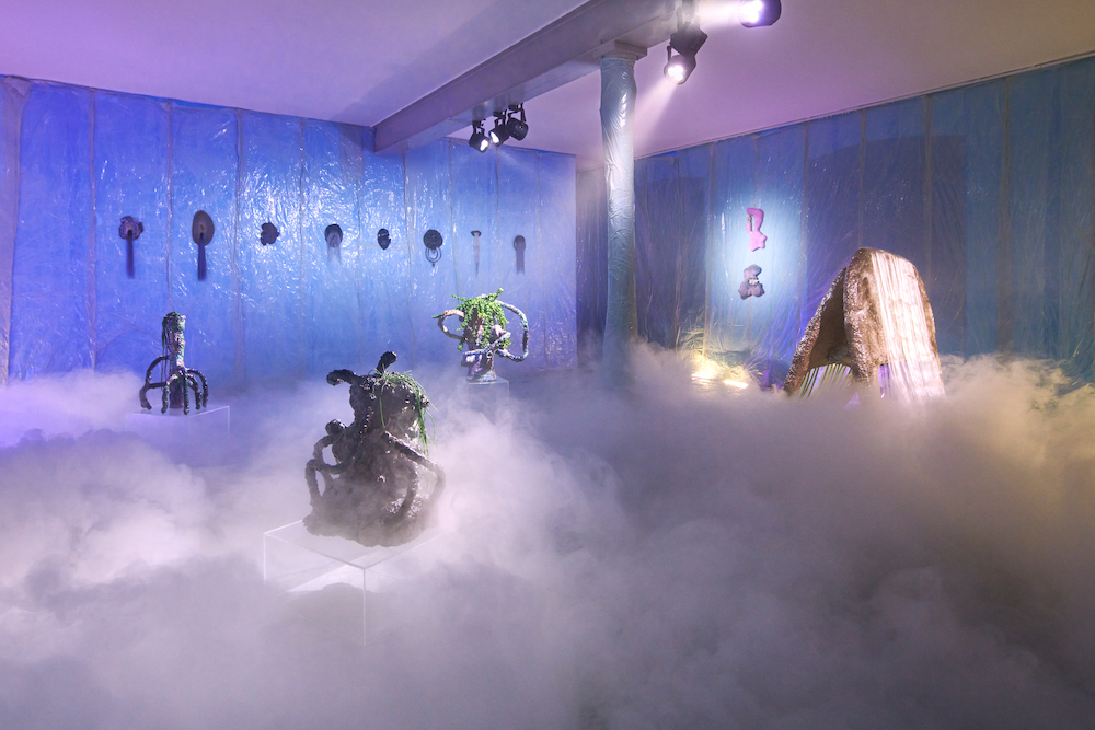 Tina Kohlmanns Arbeiten bewegen sich genau in diesem Spannungsfeld zwischen Materialität und Imagination, zwischen Körper und Spekulation. Ihre Objekte wirken wie Überbleibsel einer fremden Kultur – Relikte aus einer Sphäre, die sich gängigen Ordnungen entzieht. Dabei sind ihre Skulpturen ebenso humorvoll wie unheimlich, ebenso künstlich wie verletzlich. Der Ausstellungsraum verwandelt sich dabei zu einem liminalen Raum, den Stofflichkeit und Licht zu einer blauen Membran zwischen Realität und Imagination verdichten.
